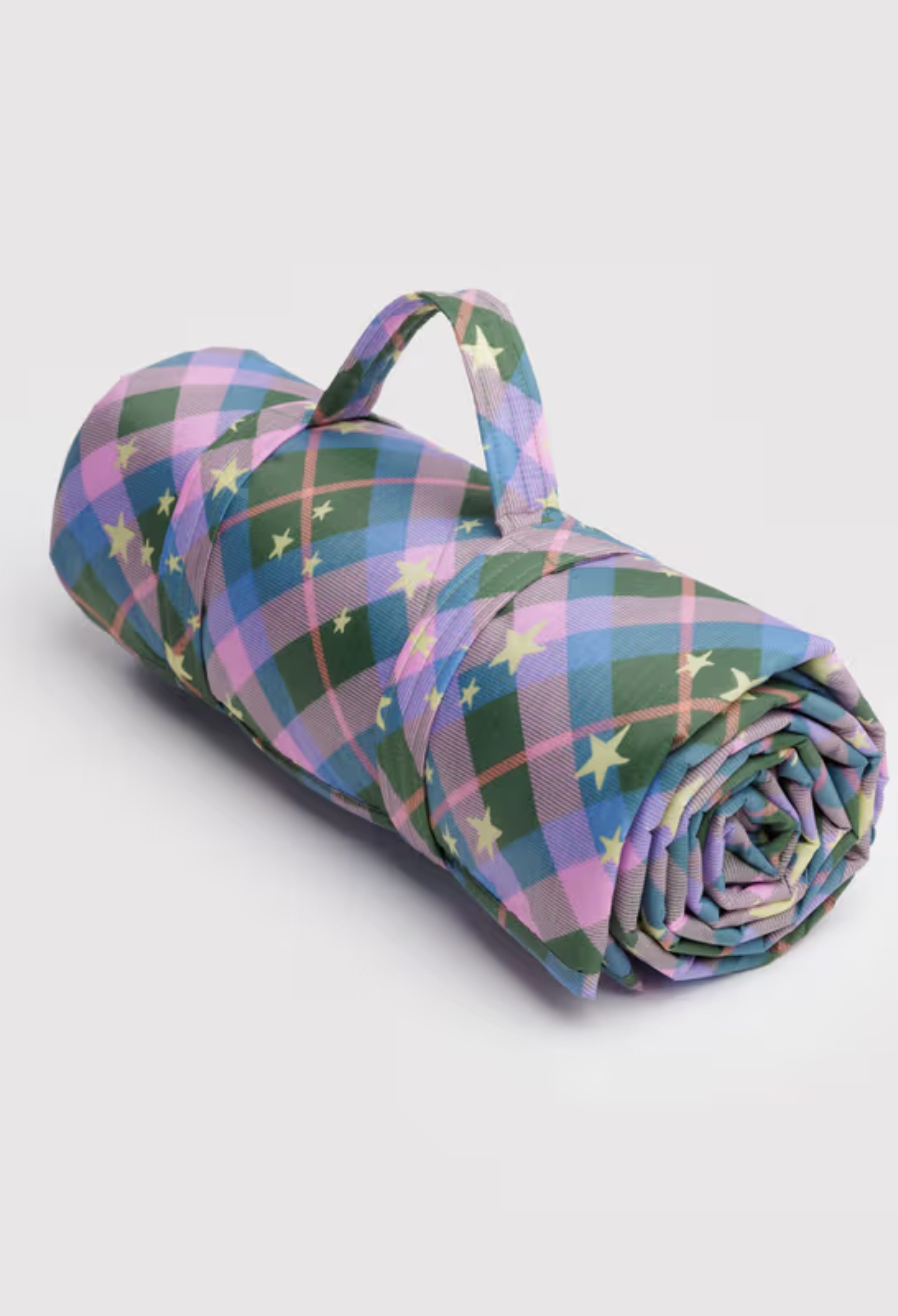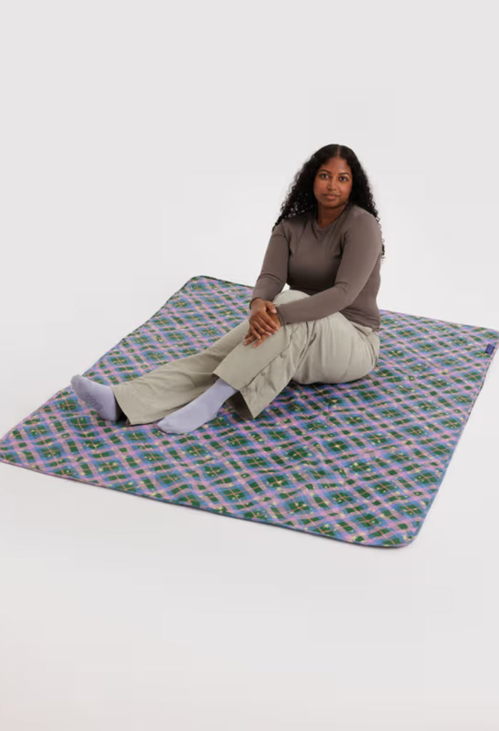 This BAGGU Puffy Picnic Blanket quilted ripstop picnic blanket with carrying strap is perfect for flinging in the garden for summer sun traps or taking to the beach and park with the easy to roll design and carry strap!