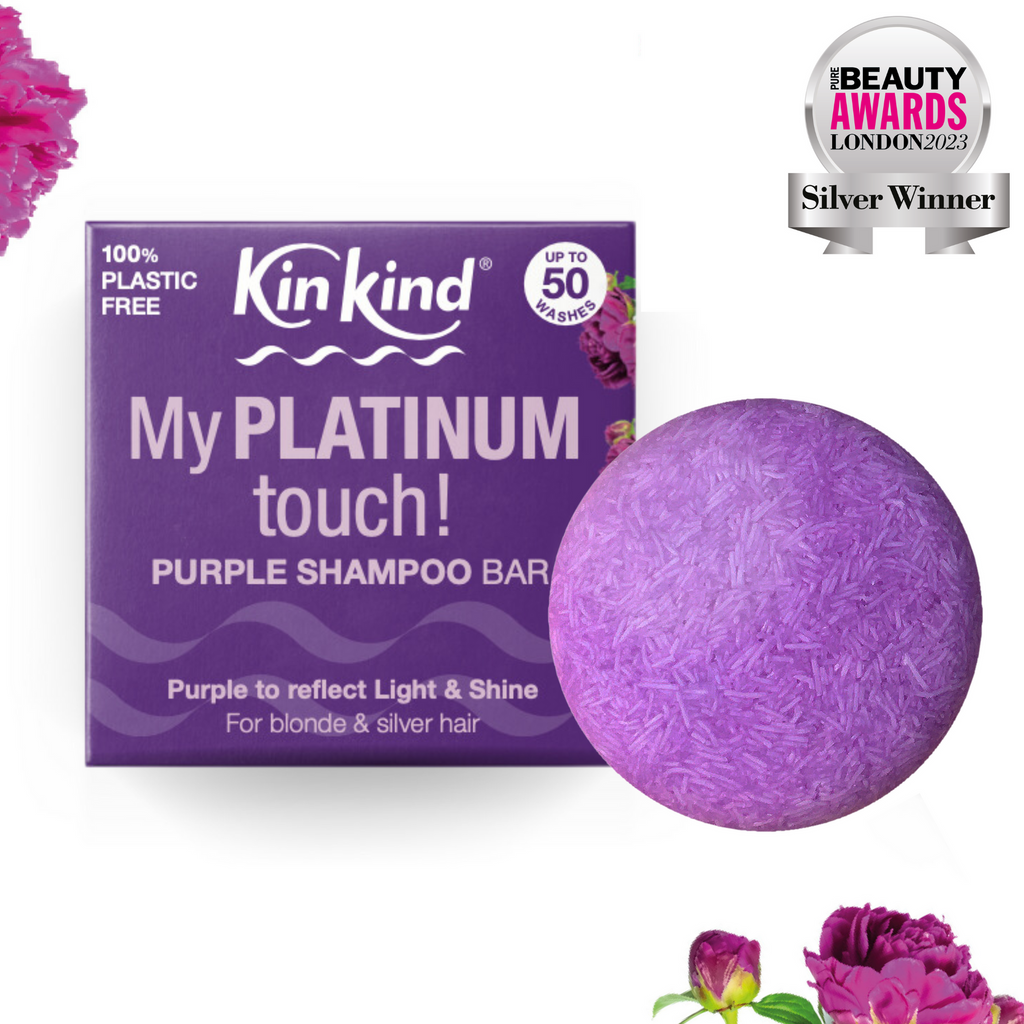 Say goodbye to brassy, yellow dry hair and hello to platinum shine with KinKind's My PLATINUM touch! purple shampoo bar. Our best purple shampoo when it comes to maintenance for your blonde hair, white/silver hair, bleached and highlighted hair, it reflects light to offset brassiness & give shine to your hair.