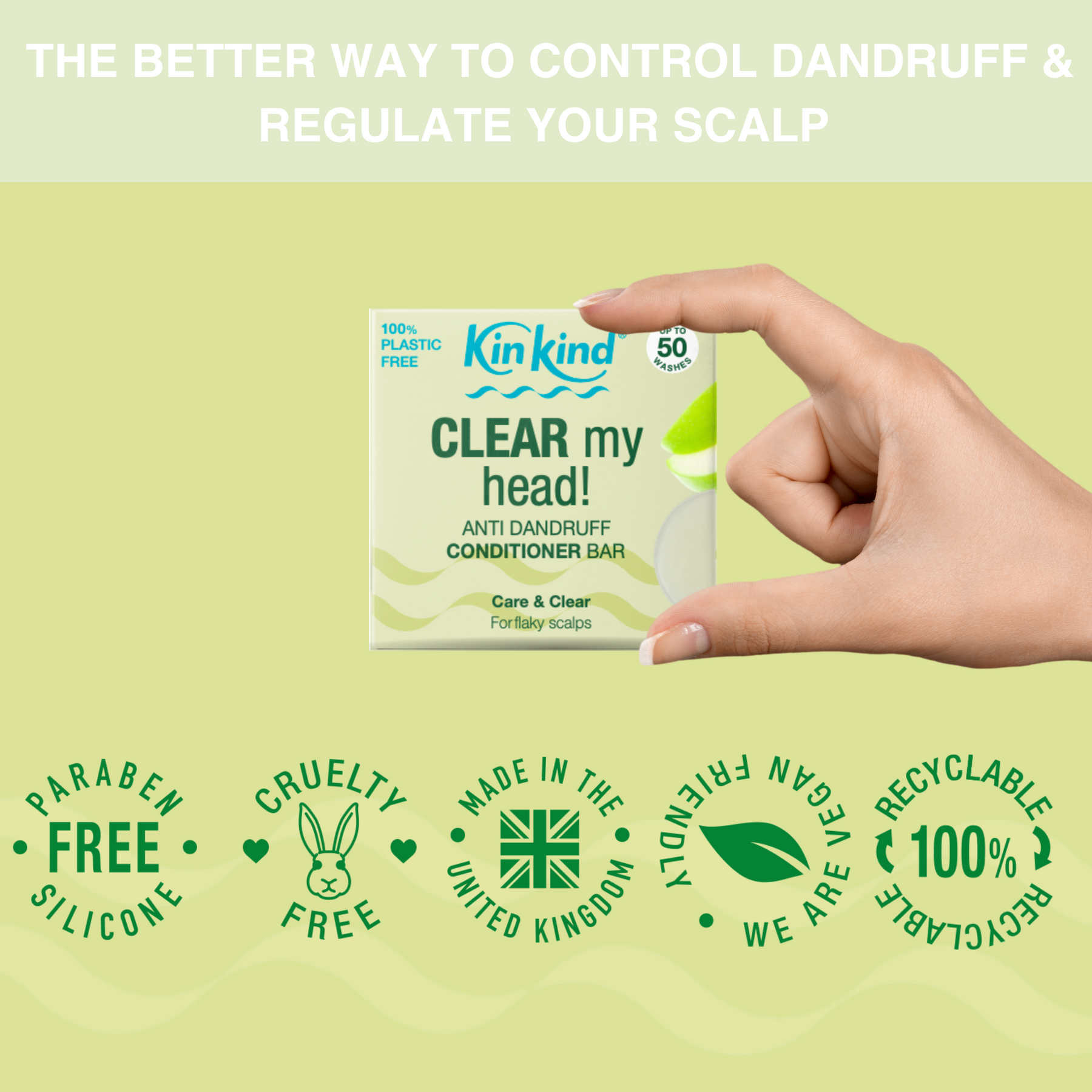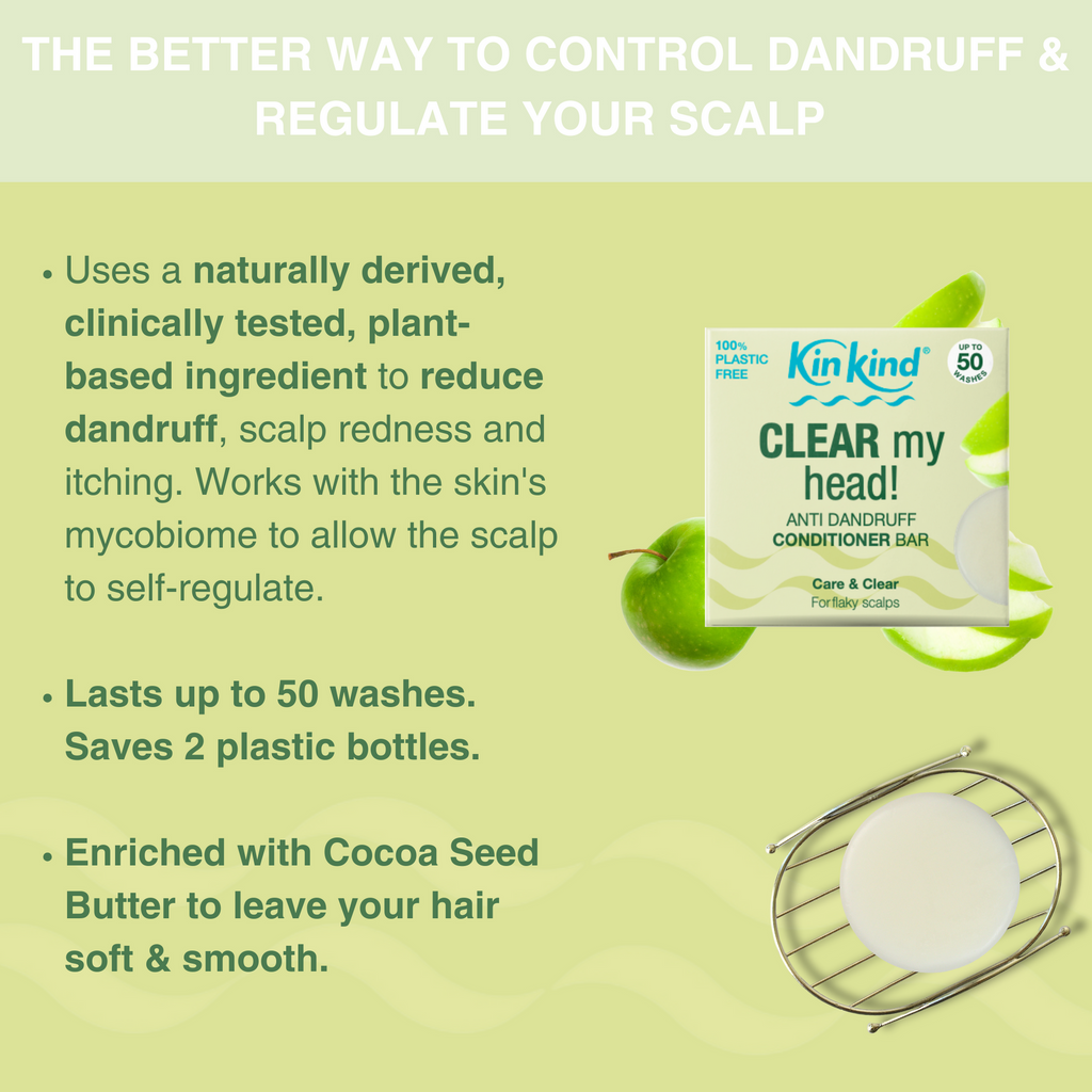 KinKind Anti-Dandruff Conditioner bar for Flaky Scalp is a breakthrough! It uses a naturally derived, plant-based ingredient to reduce dandruff, scalp redness and itching. It is a clinically tested green alternative to conventional anti-dandruff actives, that works with the skin's mycobiome to allow the scalp to self-regulate.