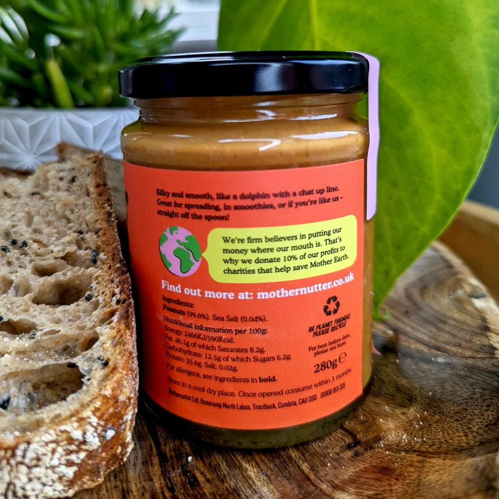 Silky and smooth, like a dolphin with a chat up line. This Smooth peanut butter from Mothernutter is 100% natural, vegan and contains no palm oil or added sugar. Great for spreading, in smoothies, or if you’re like us – straight off the spoon!