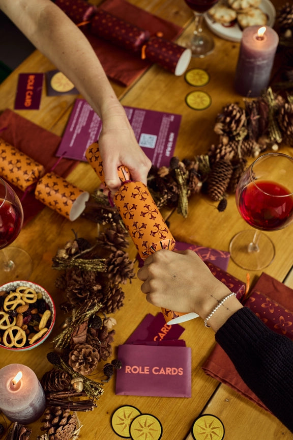 - - 6 crackers each containing 1 Role card, 1 Gold token and 1 Mission card (plus a joke and a hat!).