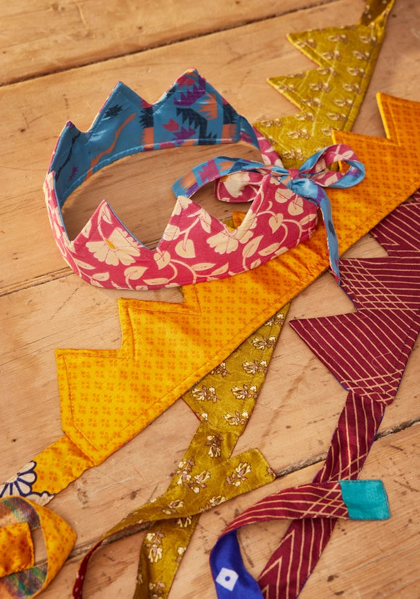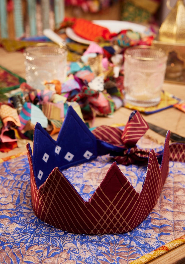 Celebrate Christmas and other special occasions with an eco friendly, reusable crown hat. This reversible design features unique recycled sari prints on each side, allowing you to switch up your look with two hats in one! Easily adjustable for all ages, it is secured by long, matching fabric ties at the back. When you're done, simply store it away until your next sustainable celebration.