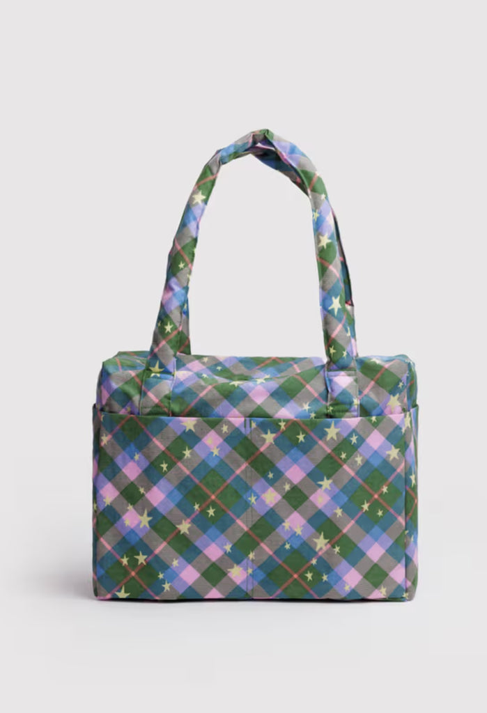 The BAGGU Carry On Cloud Bag in a Smaller size than the original is a travel bag optimised for flying: it fits under an airplane seat, on top of your roller bag, and on your shoulder.