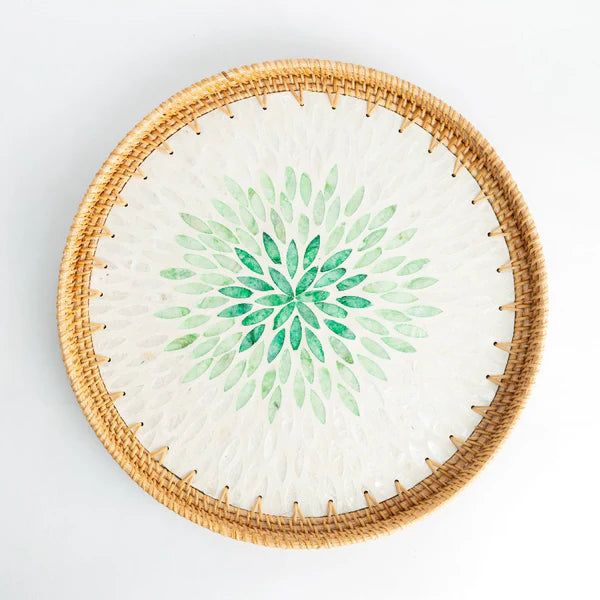 With a delicate, flower-like pattern at its center, this Mother of Pearl tray blends deep emerald greens and pale mint tones, all surrounded by a lustrous white sheen. Its iridescent finish reflects light with a soft glow, making it an exquisite addition to any room.