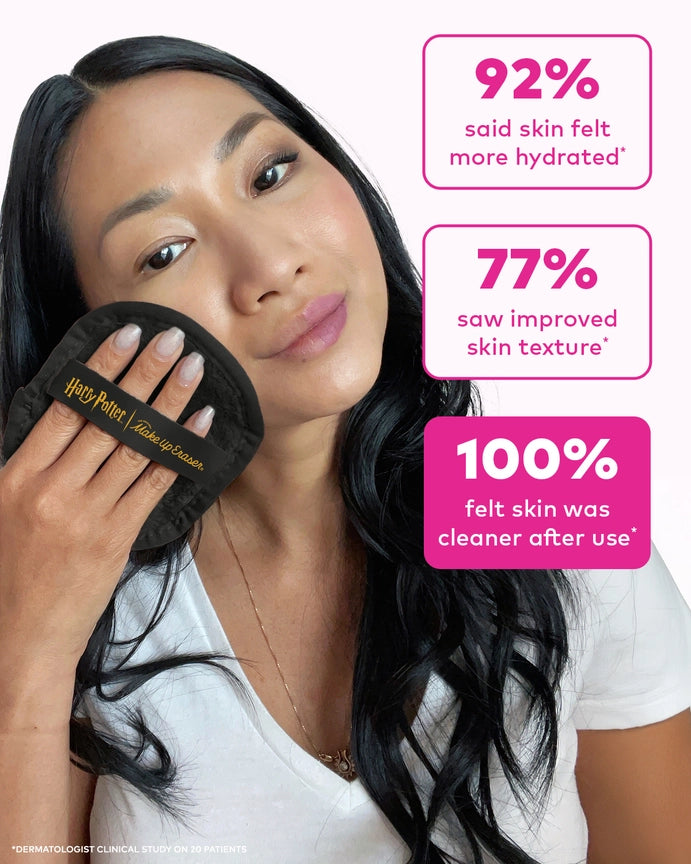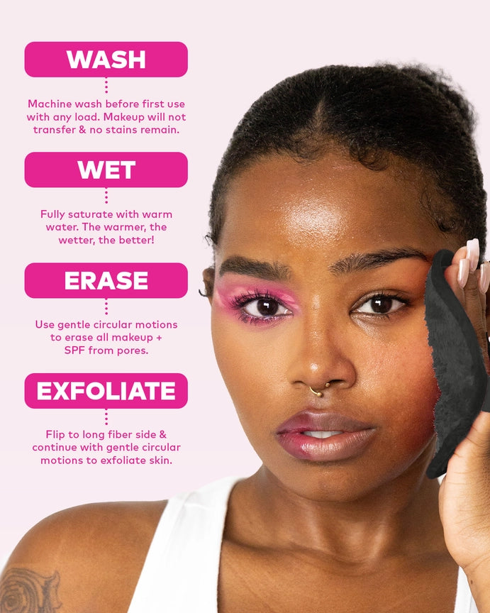 Erase all makeup with JUST WATER™ including waterproof makeup and mascara! The original and patented makeup eraser is activated by water and the cloud-soft fibers gently and easily remove all makeup and sunscreen from pores!